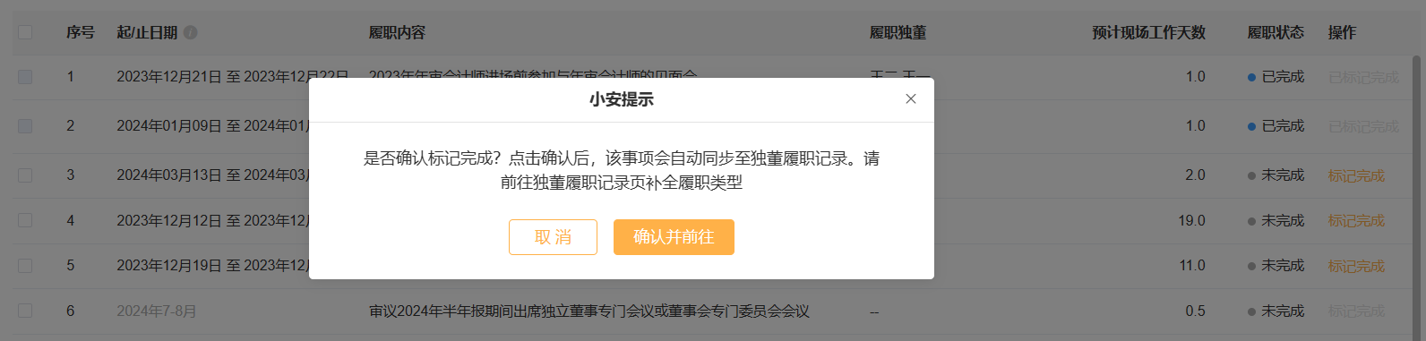 系统将提示是否同事生成履职记录,点击“确认并前往”将跳转至履职记录编辑页面。