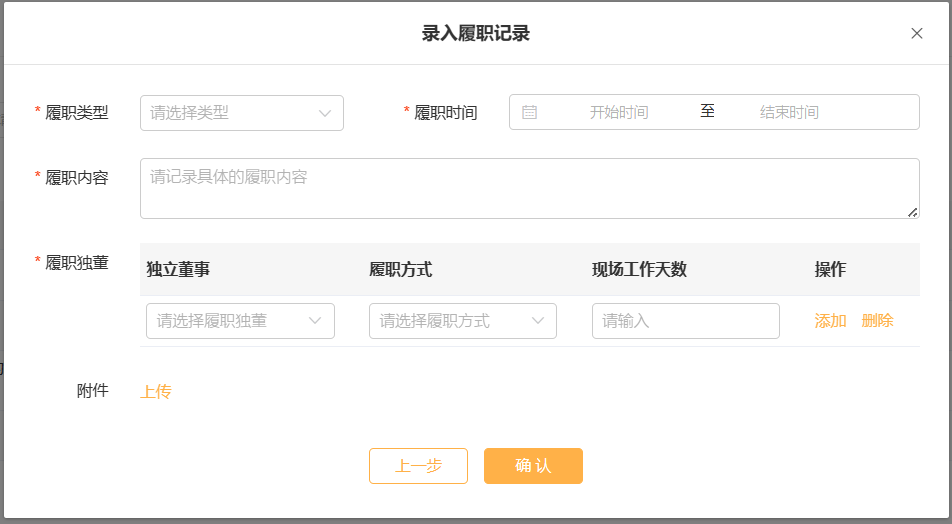 填写履职类型、履职时间、履职内容等信息,选择履职独董,并记录履职方式与现场工作天数。