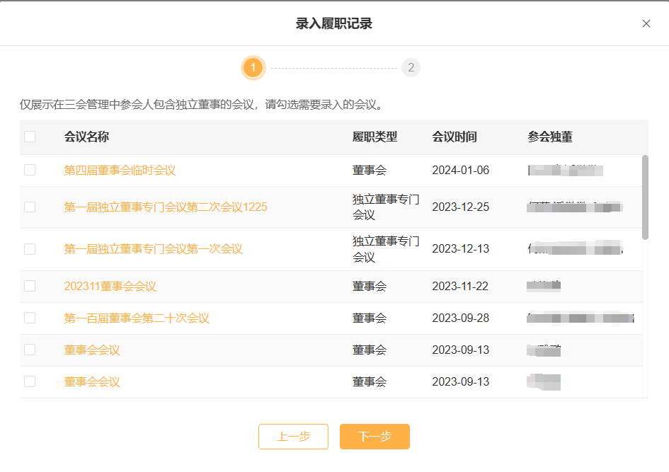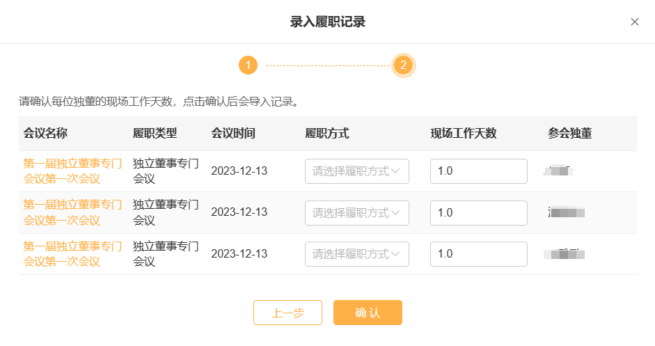 勾选独董参加的会议,选择履职方式、确认现场工作天数,完成录入。