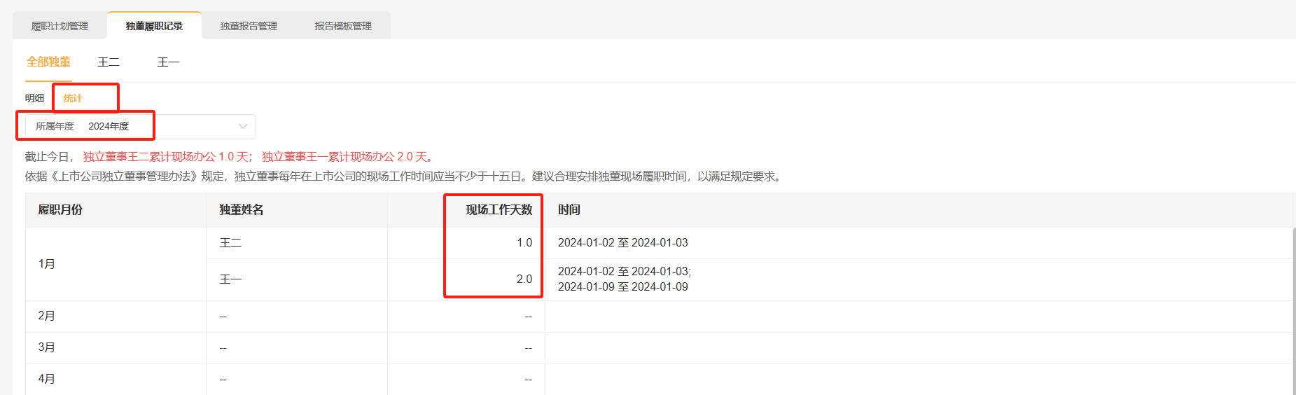切换至“统计”页面,选择所属年度,系统将自动统计各独董的现场工作天数。