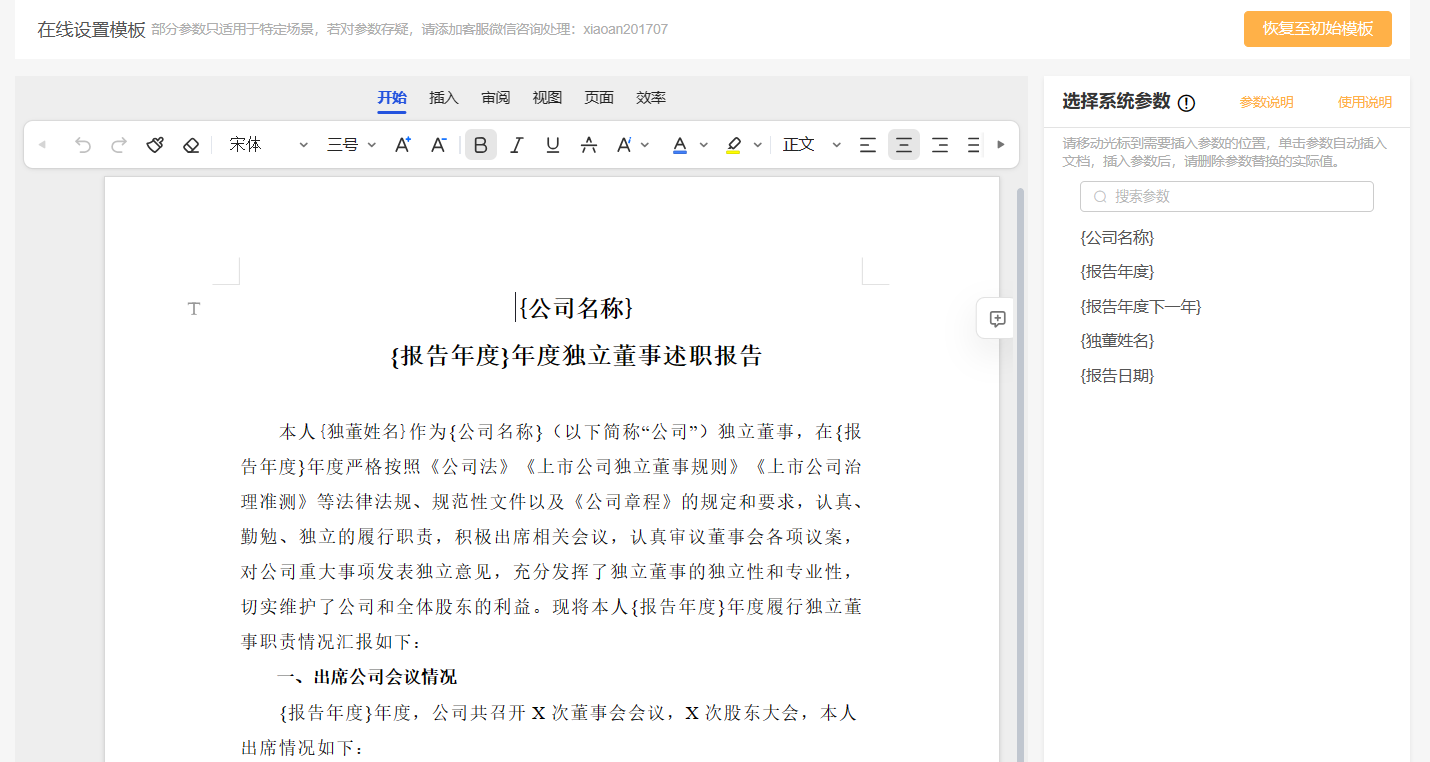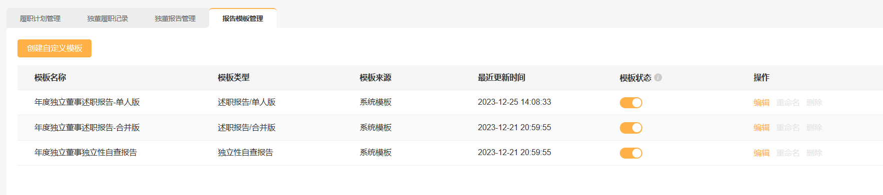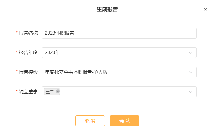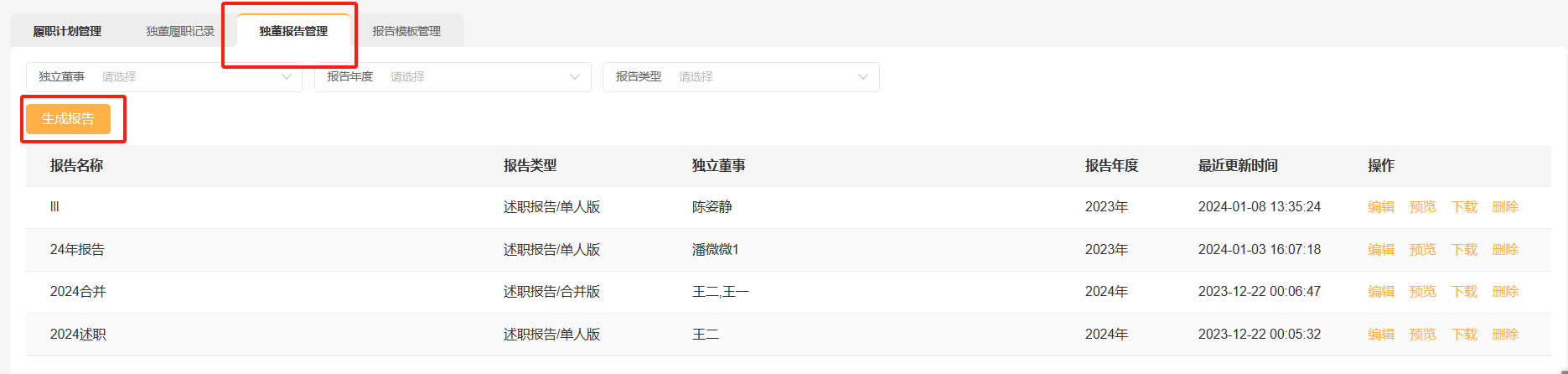 在这个页面,用户点击“生成报告”,选择报告年度、报告模板以及独立董事后可以生成对应的文档报告。同时支持在线编辑、预览、下载和删除操作。