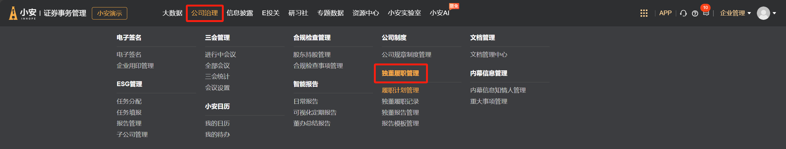 通过【小安-公司治理-独董履职管理】进入功能页面。