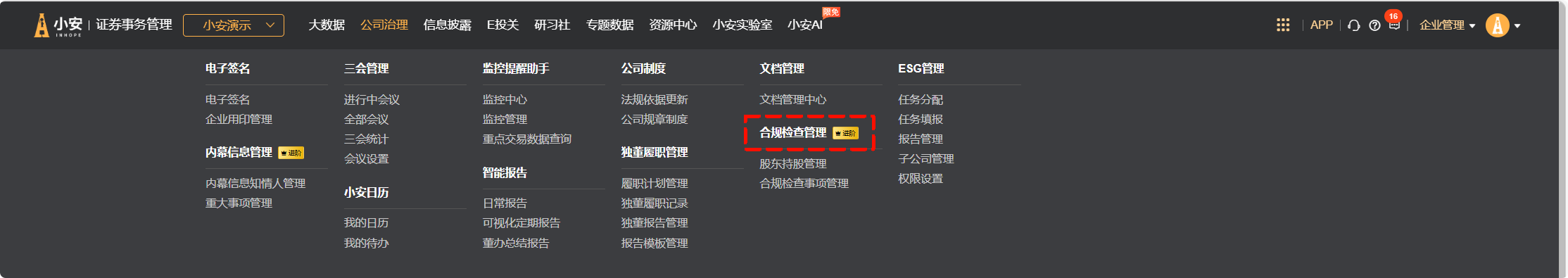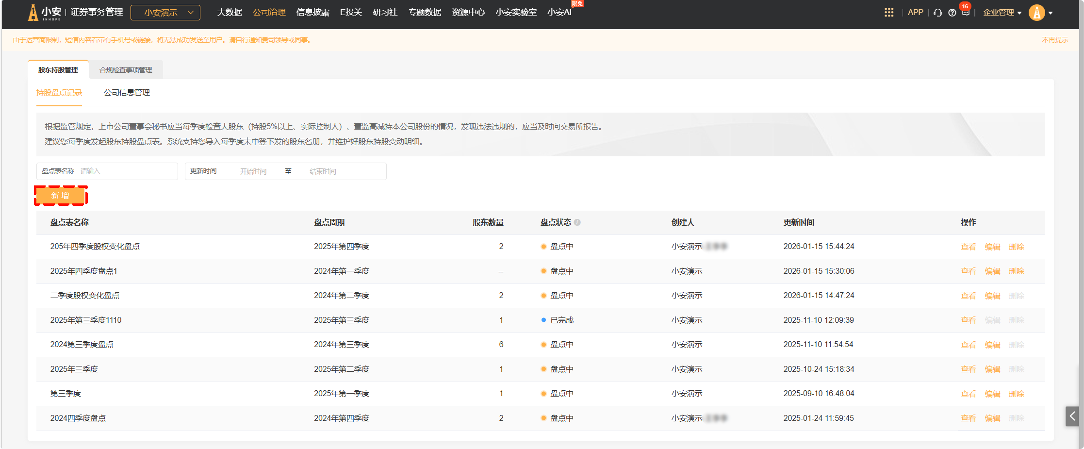小安推出“合规检查管理”功能,旨在帮助上市公司董秘高效完成每季度大股东、董监高股份变动合规检查。通过该功能,用户可在线发起持股盘点,系统将自动完成合规校验,并支持一键发起签名确认,大幅提升工作效率。