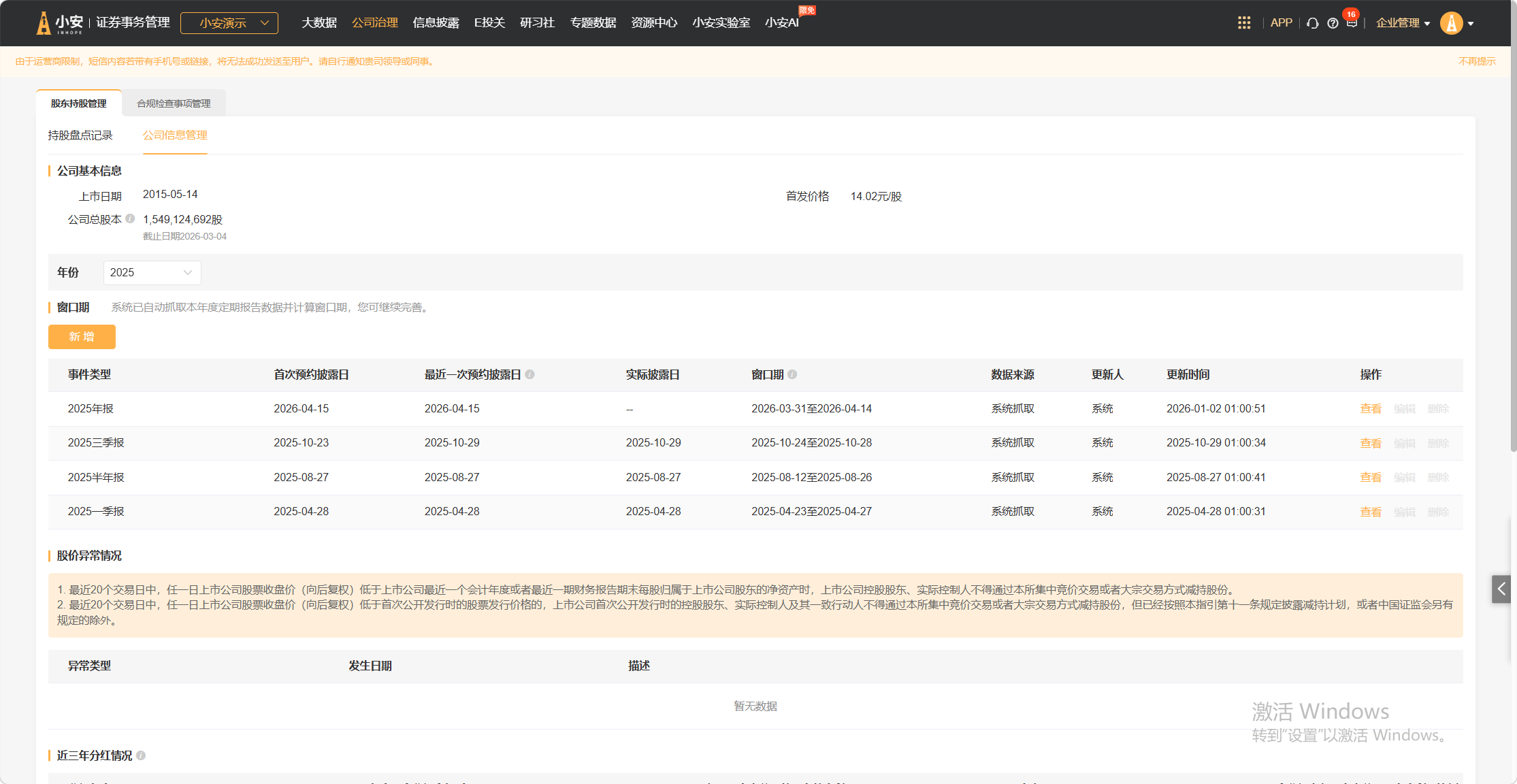 在该页面,系统将自动获取上市日期、首发价格、公司总股本等公司基本信息,并根据定期报告预约披露时间自动计算对应窗口期。
