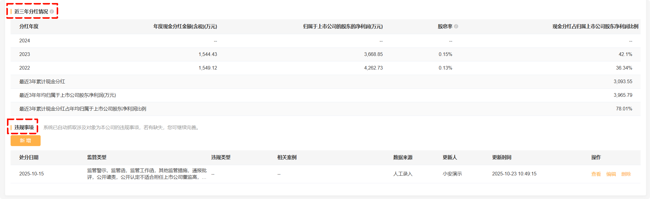 同时在下方可以查看公司近三年现金分红情况以及违规事项,如有系统未抓取到的违规事项,可以点击“新增”,自行添加。