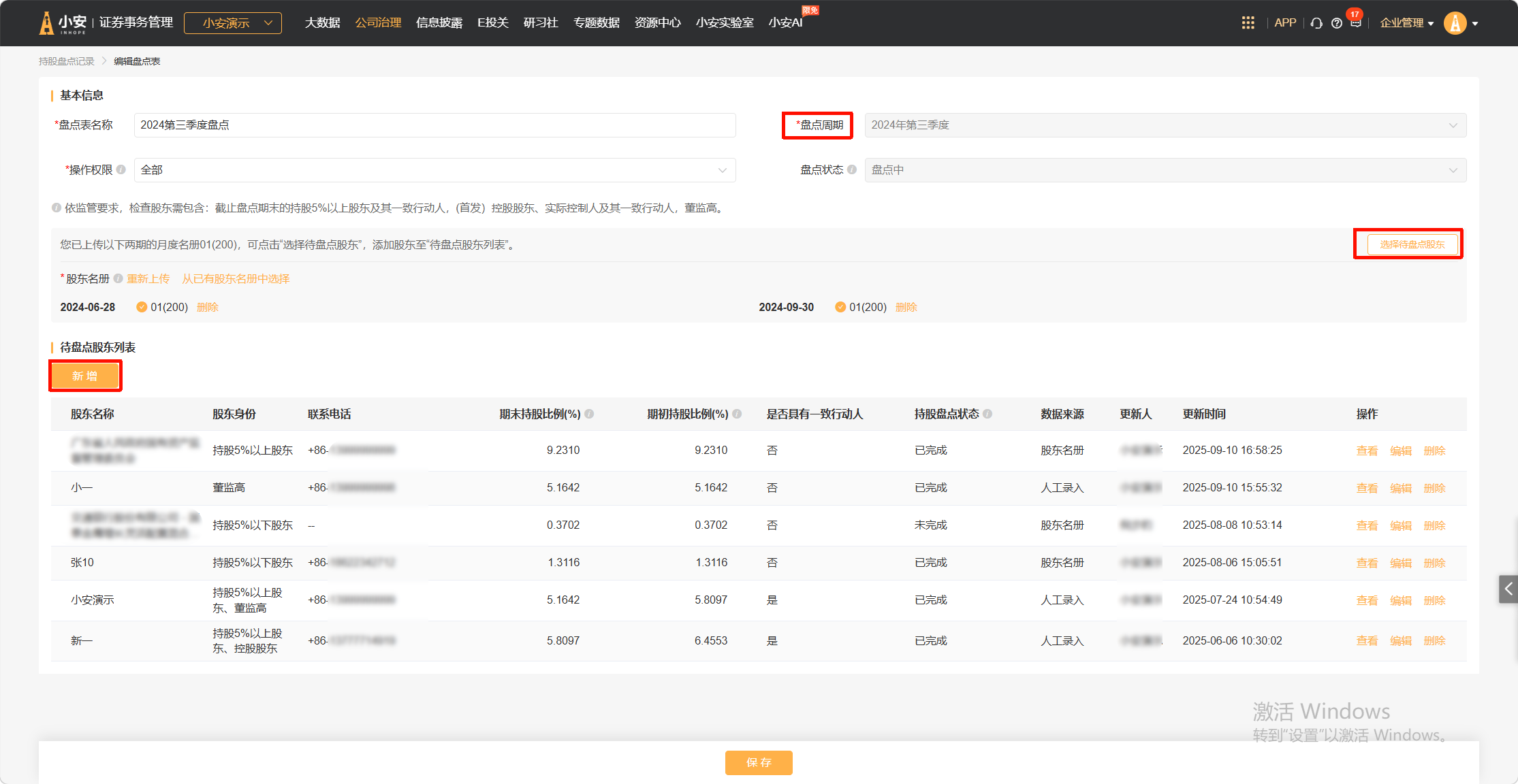 此外,系统将抓取盘点周期内,该股东的股份变动记录、违规事项以及减持计划,若有缺失,可以点击“新增”按钮添加。