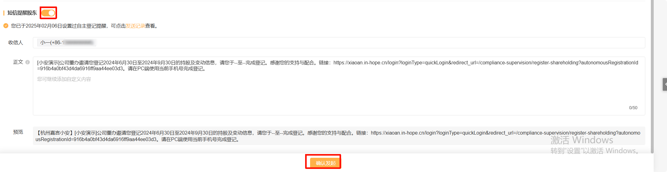 打开“短信提醒”开关,系统将通过短信向股东发送登记提醒。确认无误后,点击“确认发起”。