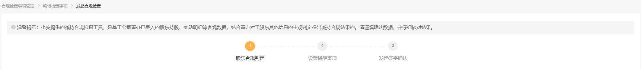 合规检查分为股东合规判定、设置提醒事项、发起签字确认三个步骤。
