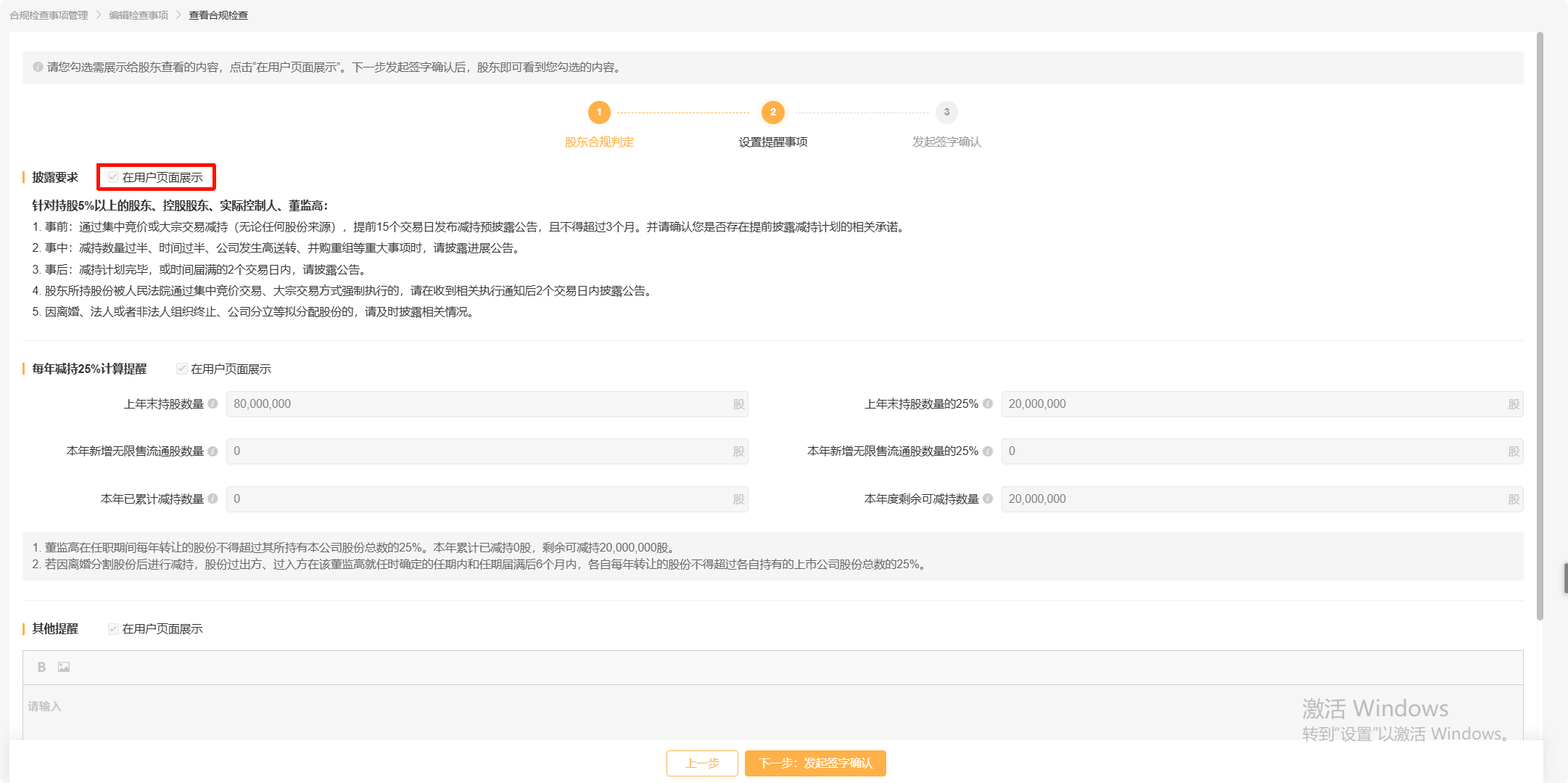 在这一步骤中,勾选“在用户页面展示”,可以选择将哪些内容展示在股东查看页面。