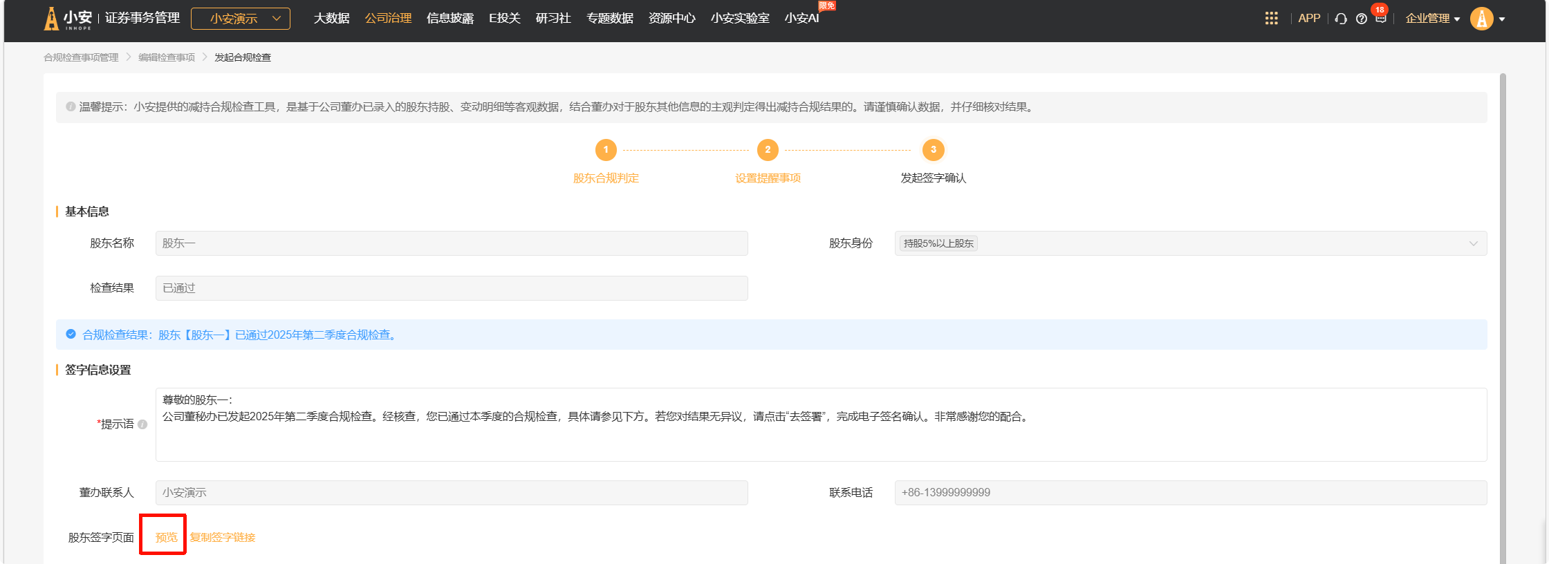 在签字发起步骤中,支持修改股东查看页面提示语,预览股东查看页面并复制签名链接。