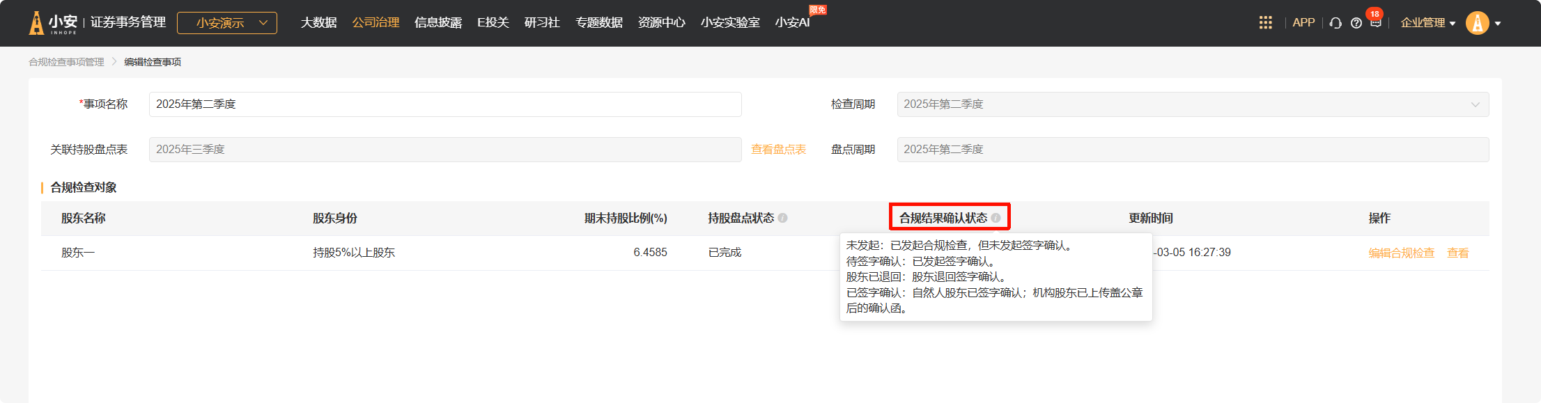 在检查事项详情页,可针对已完成盘点的股东,发起合规检查。