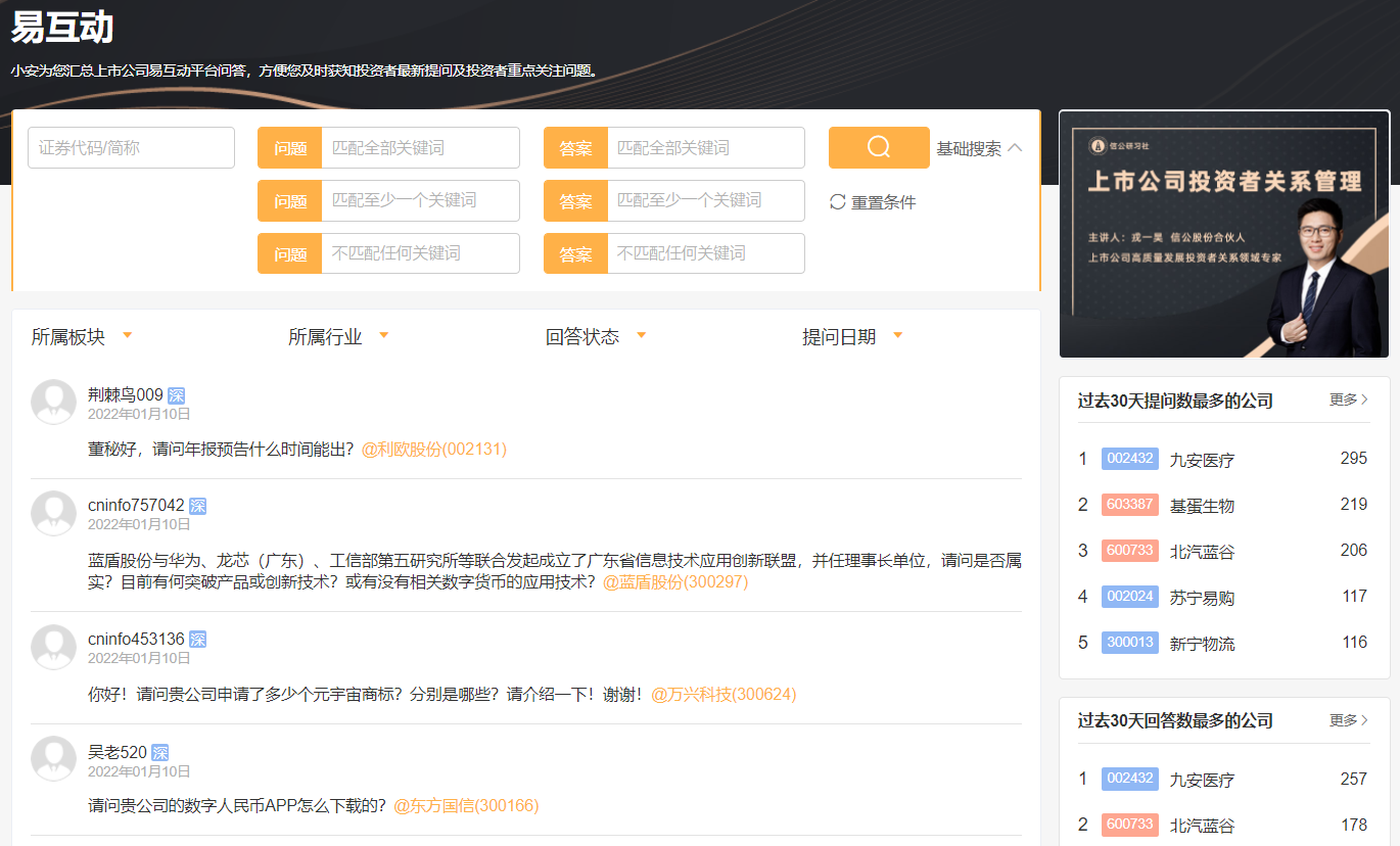 在【互动易/E互动】搜索模块,可以通过搜索关键词查询投资者问答内容。在页面右侧可以看到近30天内提问数最多和回答数最多的公司排名。