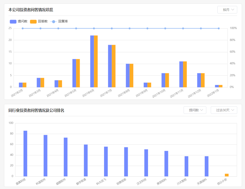 进入【公司互动易/E互动】,可以查看可视化的本公司问答概览情况及本公司在同行业公司中的排名。