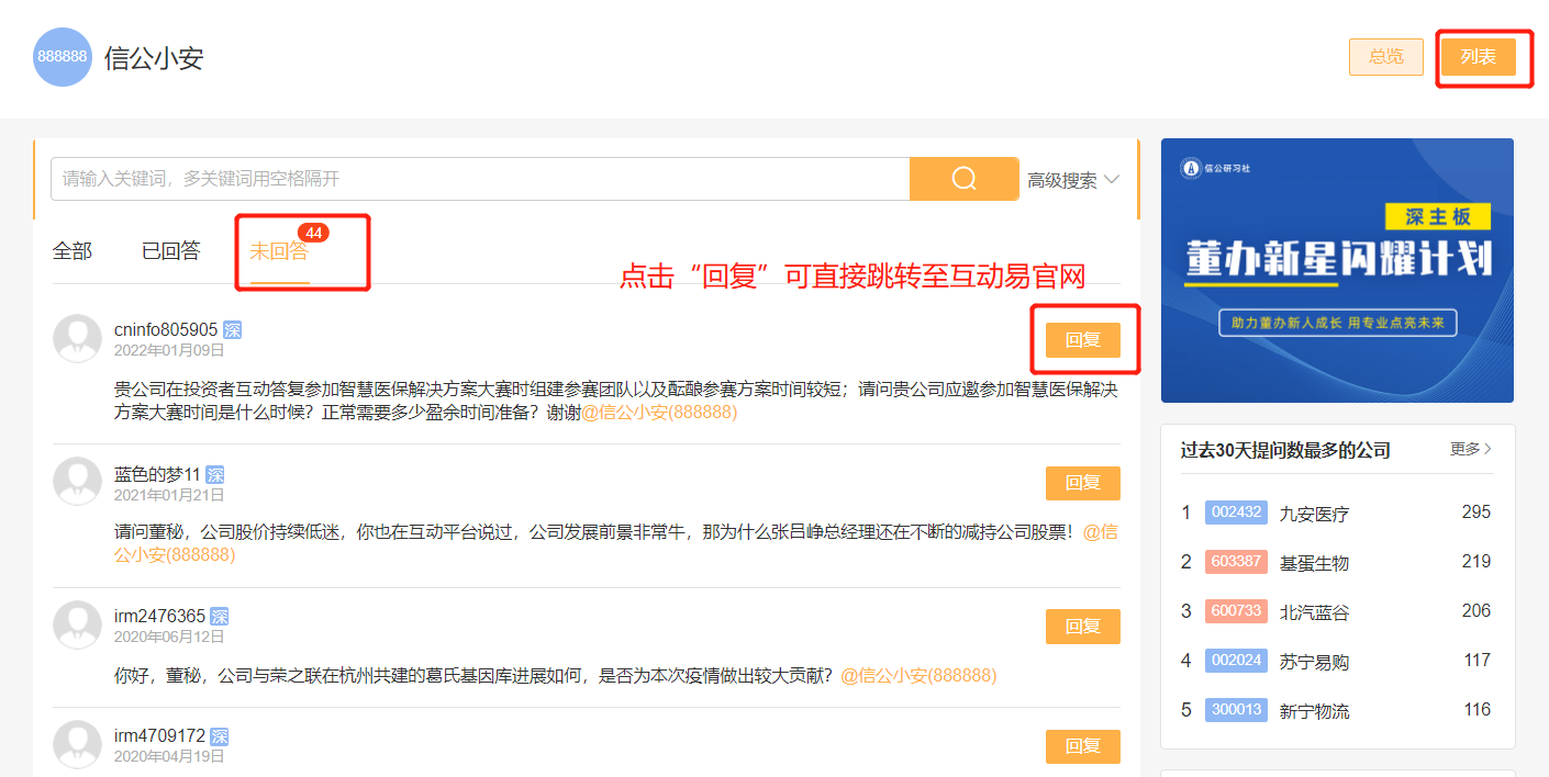 切换至列表模式,可以查看本公司的全部问答,点击“未回答”列表中的回复,可直接跳转至官方平台进行回复。