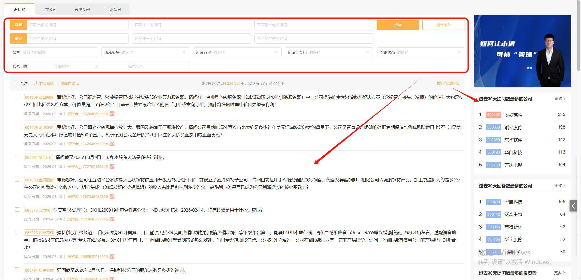 在【互动易/E互动】搜索模块,可以通过搜索关键词、所属板块、回答状态等查询投资者问答内容。在页面右侧可以看到近30天内提问数/回答数最多的公司以及提问最多的投资者排名。