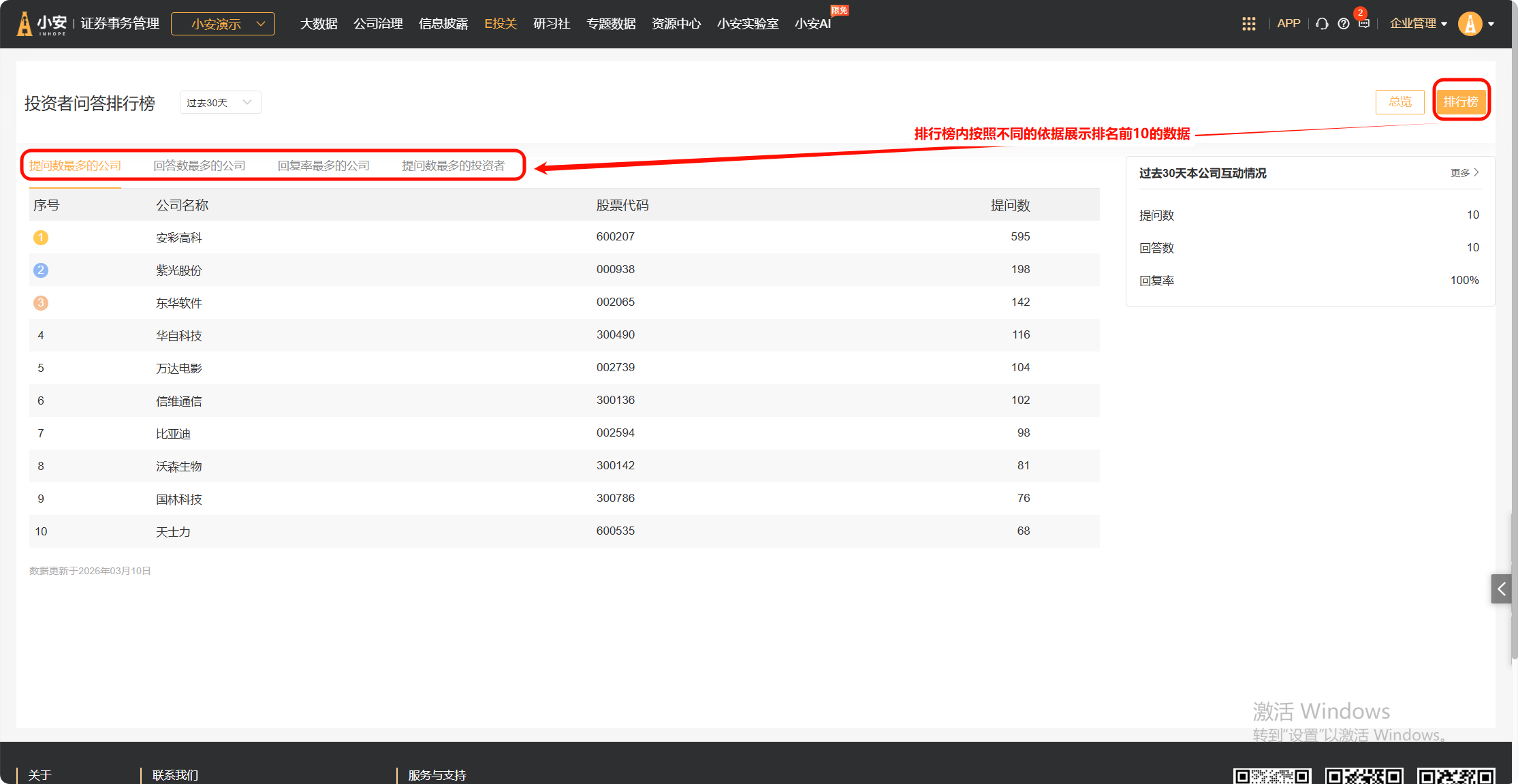 小安的【互动易/E互动】栏目,汇总了上市公司易互动平台问答,方便董办人员及时获知投资者最新提问及投资者重点关注问题。